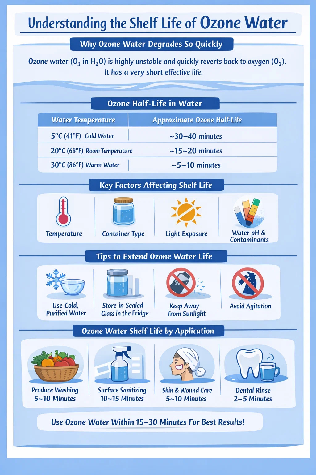 Etiam cum omnibus his positis, optimum est instituere uti aqua tua ozono intra 30 minuta generationis. Quidquid ultra hoc in potentia tractari debet percelli, praesertim si fretus es ad sanitationi vel disinfection- tionis proposita, ubi efficacia critica est.