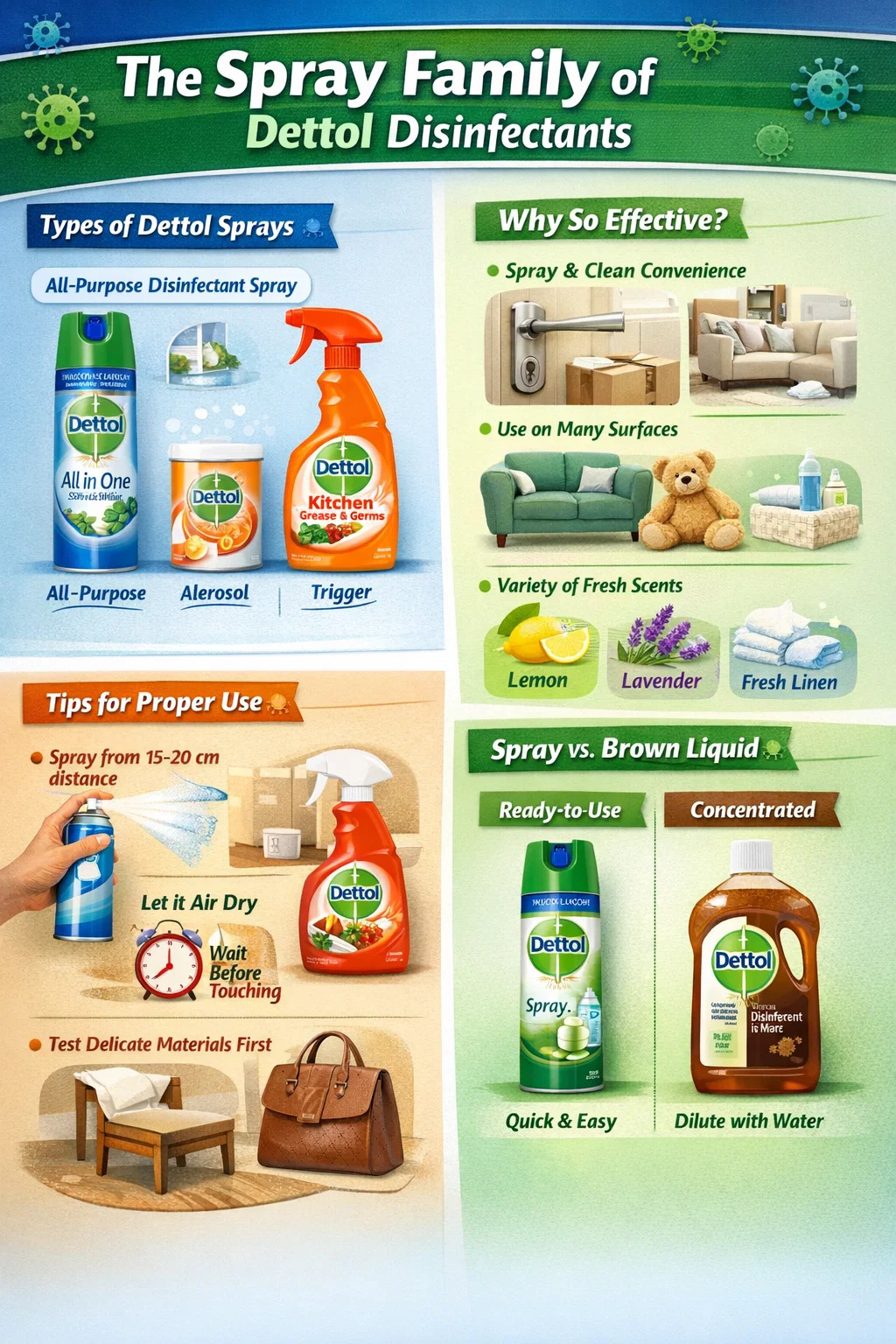 "Sprama et munda" commodum: Traditional Dettol disinfectant cum aqua dilutum, bibula, vel cum panno tergendo requirit, dum aspergine disinfectant ius e lagena uti paratum est, id specimen facit ad minutas res disinfectas sicut sarcinas partus, scapulas et plantas calcei.