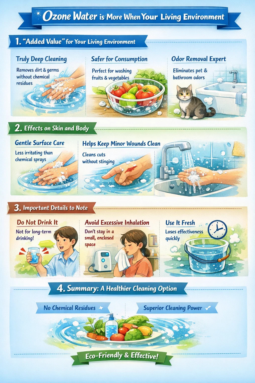 Vere Alta Purgatio: Lavantes manus seu supellex ozonis abstergendae multo lautior est quam aqua vulgari utens. Sordes invisibilis cito tollere potest, et quia tandem ad oxygenium revertitur, non debes curare de chemicis reliquiis in tabulis vel utensilia.