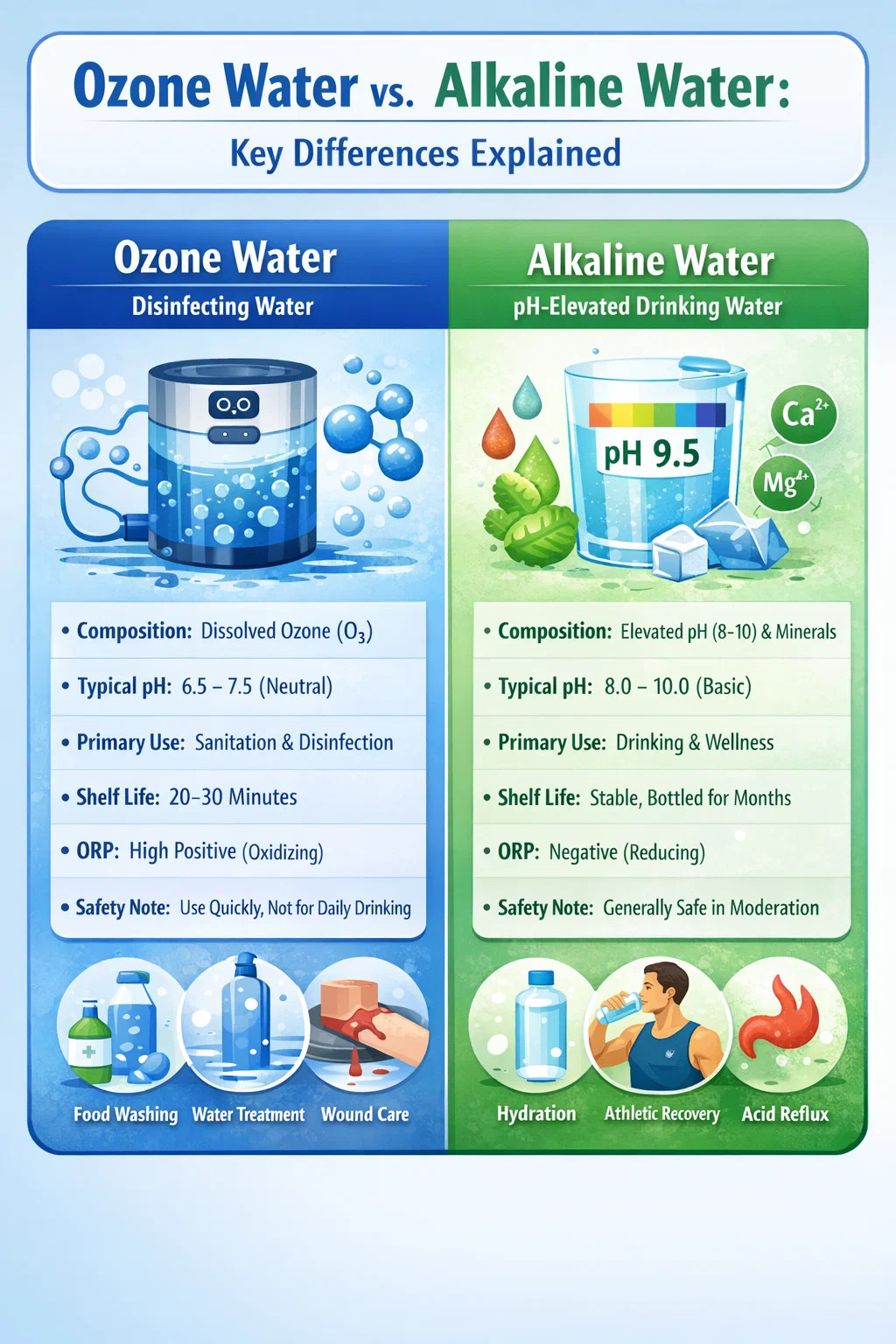 Ozona aqua et aqua alcalina sunt distincta producta cum diversis chymicis, diversis applicationibus, et diversis argumentis bases. Ozona aqua potens est, brevis disinfectans, optima ad sanitationis officia adhibita, cibum abluens, superficies tractans, aqua purificationem. Aqua alkalina est pH-elevatum productum aquae potus cum modicis et adhuc agitatis beneficiis ad hydropicos et refluxus administrationis acidorum pertinentium.